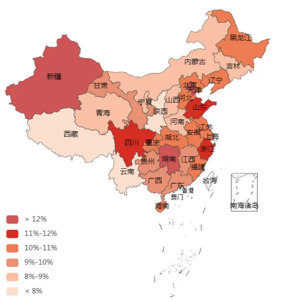 从降幅看★★◆,17个省市区报名人数减少率低于总体减少率(-8.25%)★◆◆■,增长率最高的是河南省,为2.96%。河南省增长率为正,其余均为负。
